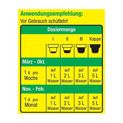 Easy to use: clean and safe dosage based on the levels I to III marked in the lid (for 1, 1.5 and 2 litres of watering water), full cap for 3.5 litres of water, seasonal use 1-2 x per week (Mar. – Oct.)