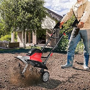 - ★MOBILE DESIGN★ This electric tiller has 2 wheels, so it can always move flexibly and smoothly. Even the less accessible areas between bushes and shrubs, this electric tiller can also work.